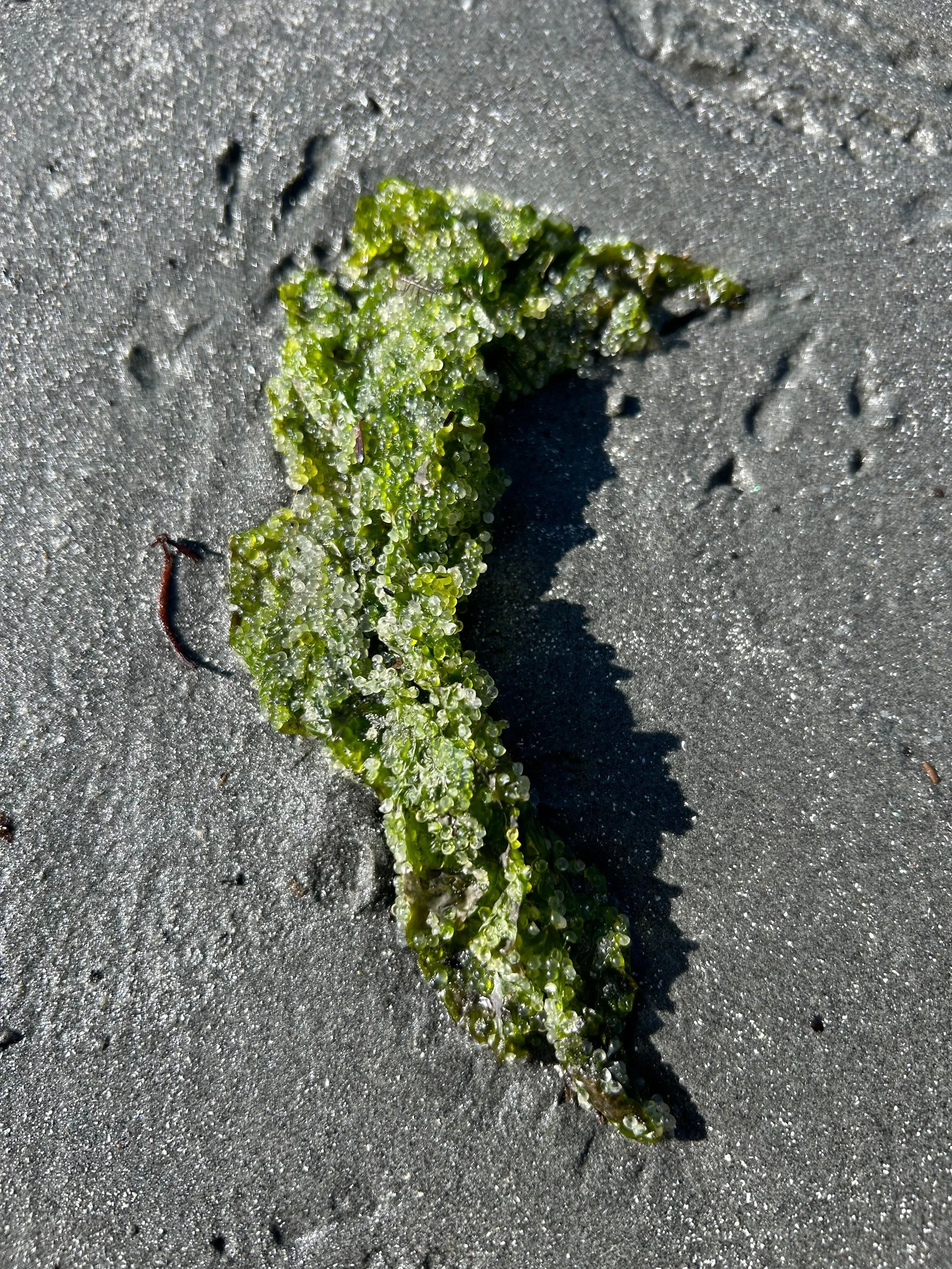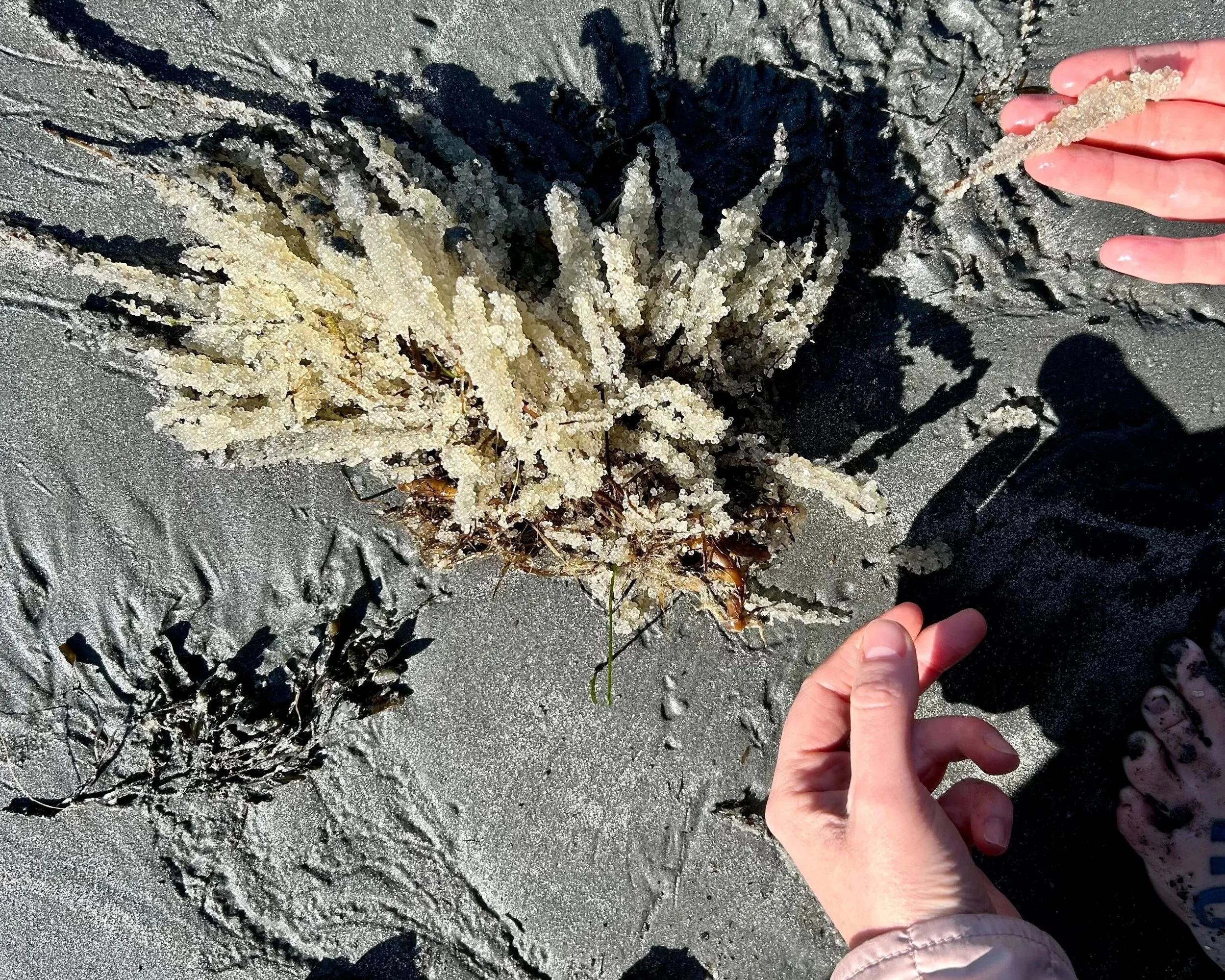 Strands of roe-coated seaweed washed onto the sand.