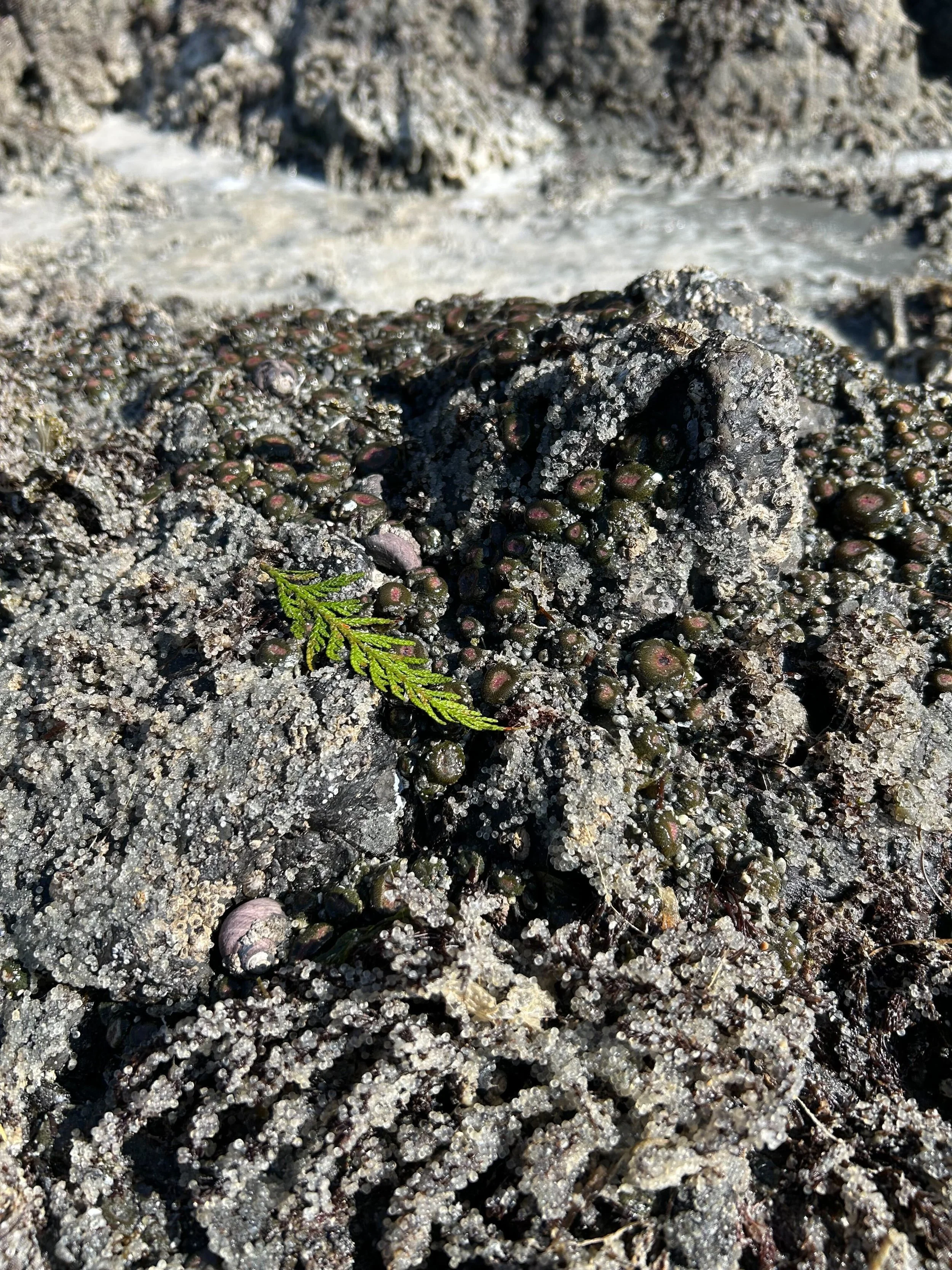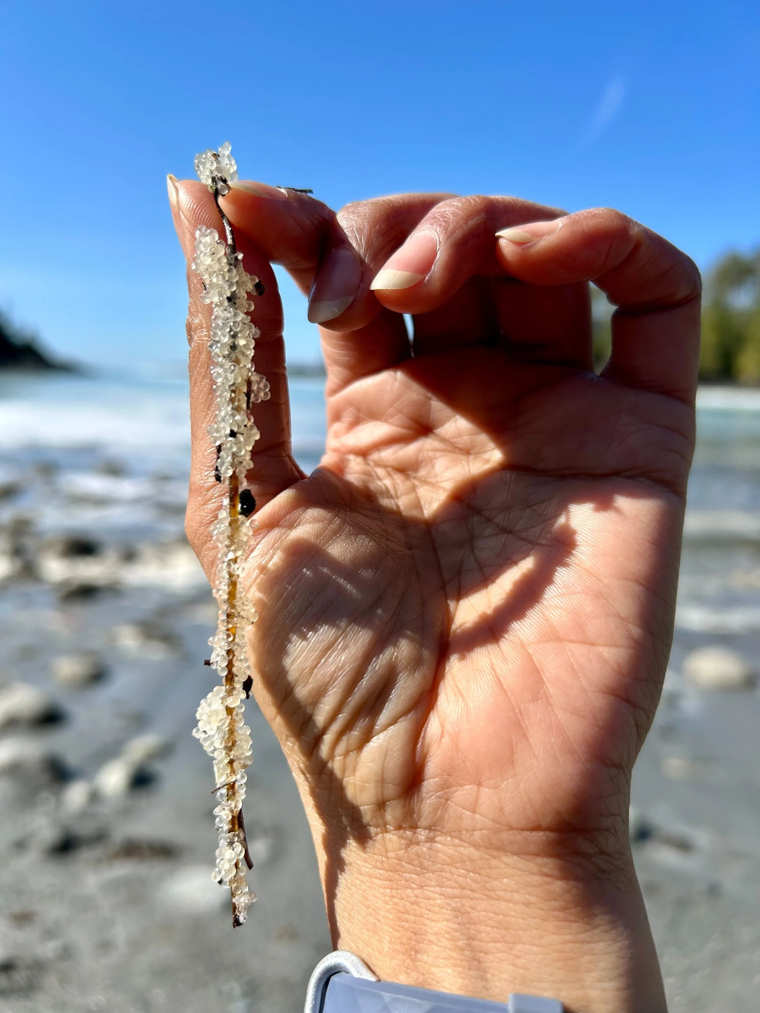 I think of the bounty of this spawning event as part of the gift economy, collectively practiced by countless generations of species thriving together in reciprocal relationships. I imagine days, precontact, where Indigenous peoples would bring gifts of ḵwáýtsay, or western hemlock branches to the shore in anticipation of the return of the spawning herring - a loving act of reciprocity.