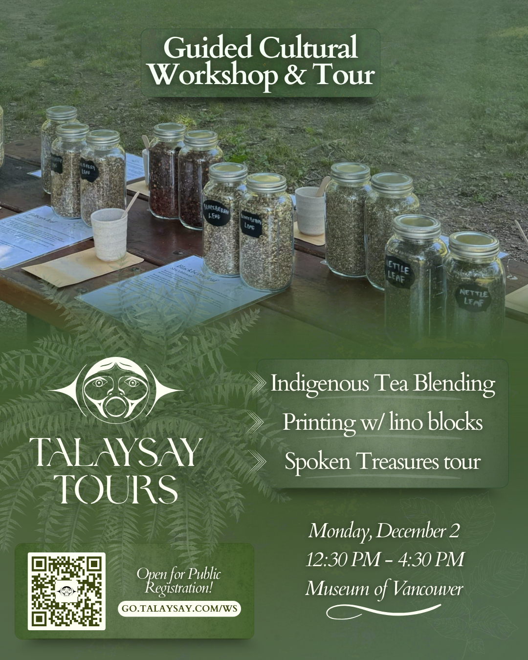 This half-day creative experience blends hands-on workshops with cultural storytelling at the Museum of Vancouver. Your group will explore Indigenous tea blending using plant-based ingredients, create hand-pressed prints using pre-made lino stamps, and enjoy a Spoken Treasures tour in the Joyce Whalley Room. All materials are provided, and no prior experience is required. This program is designed to be welcoming, interactive, and inspiring, offering your group a unique way to learn, create, and connect with culture through art, stories, and land-based teachings.